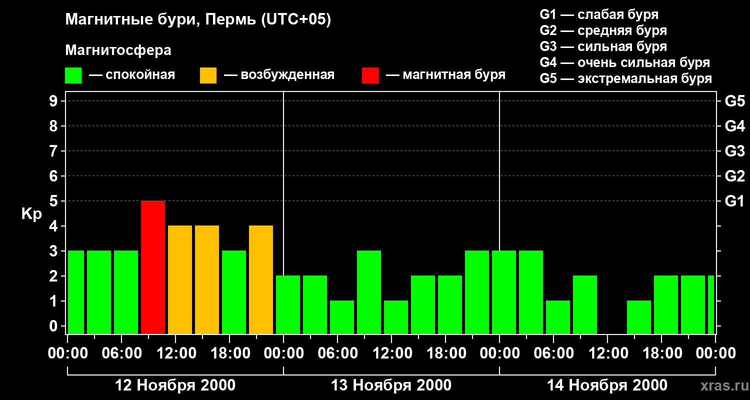Изменения геомагнитного индекса Kp с 12 по 14 ноября 2000 года для средних широт