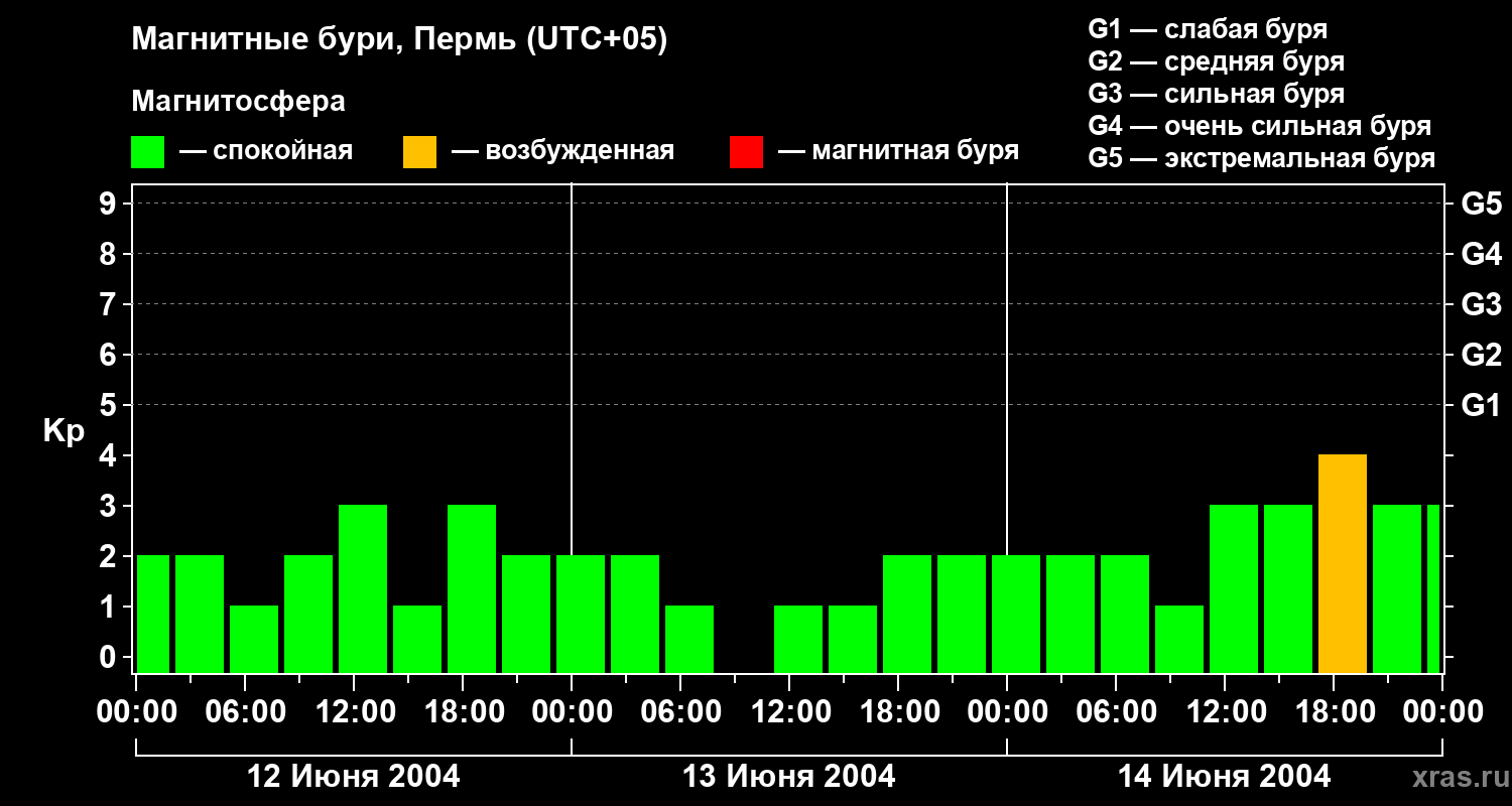 Изменения геомагнитного индекса Kp с 12 по 14 июня 2004 года для средних широт