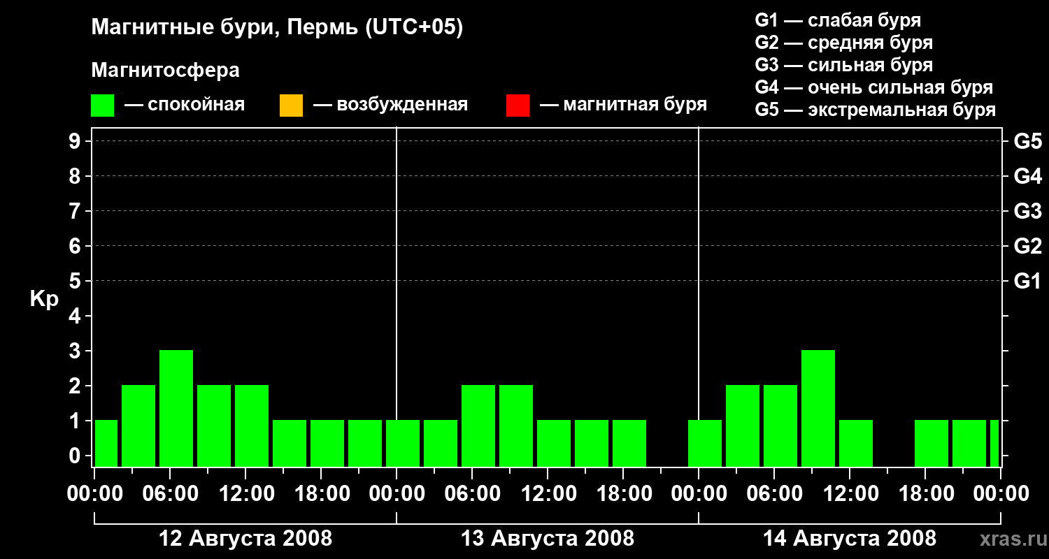 Изменения геомагнитного индекса Kp с 12 по 14 августа 2008 года для средних широт