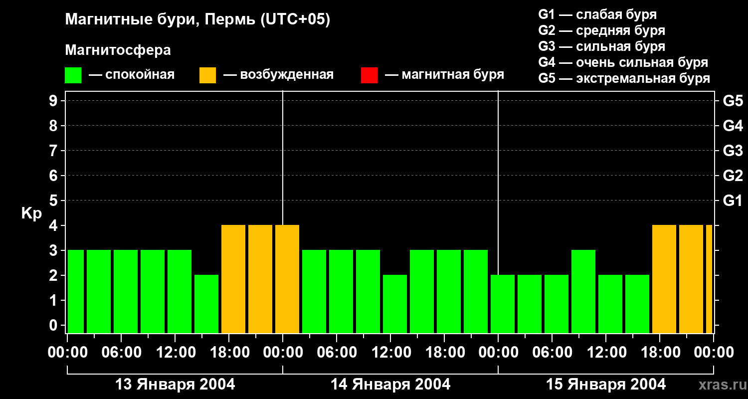 Изменения геомагнитного индекса Kp с 13 по 15 января 2004 года для средних широт