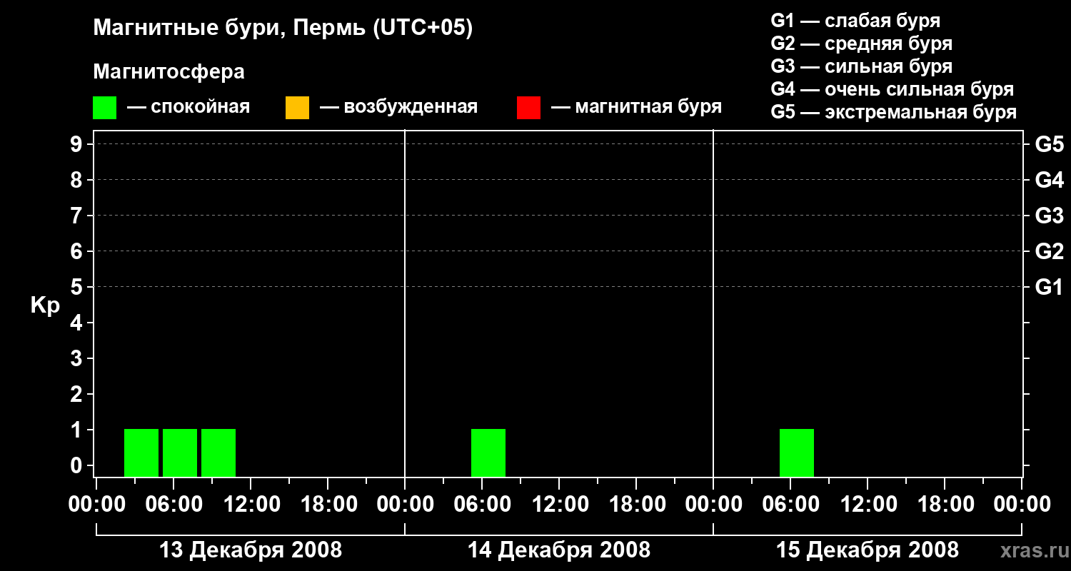 Изменения геомагнитного индекса Kp с 13 по 15 декабря 2008 года для средних широт
