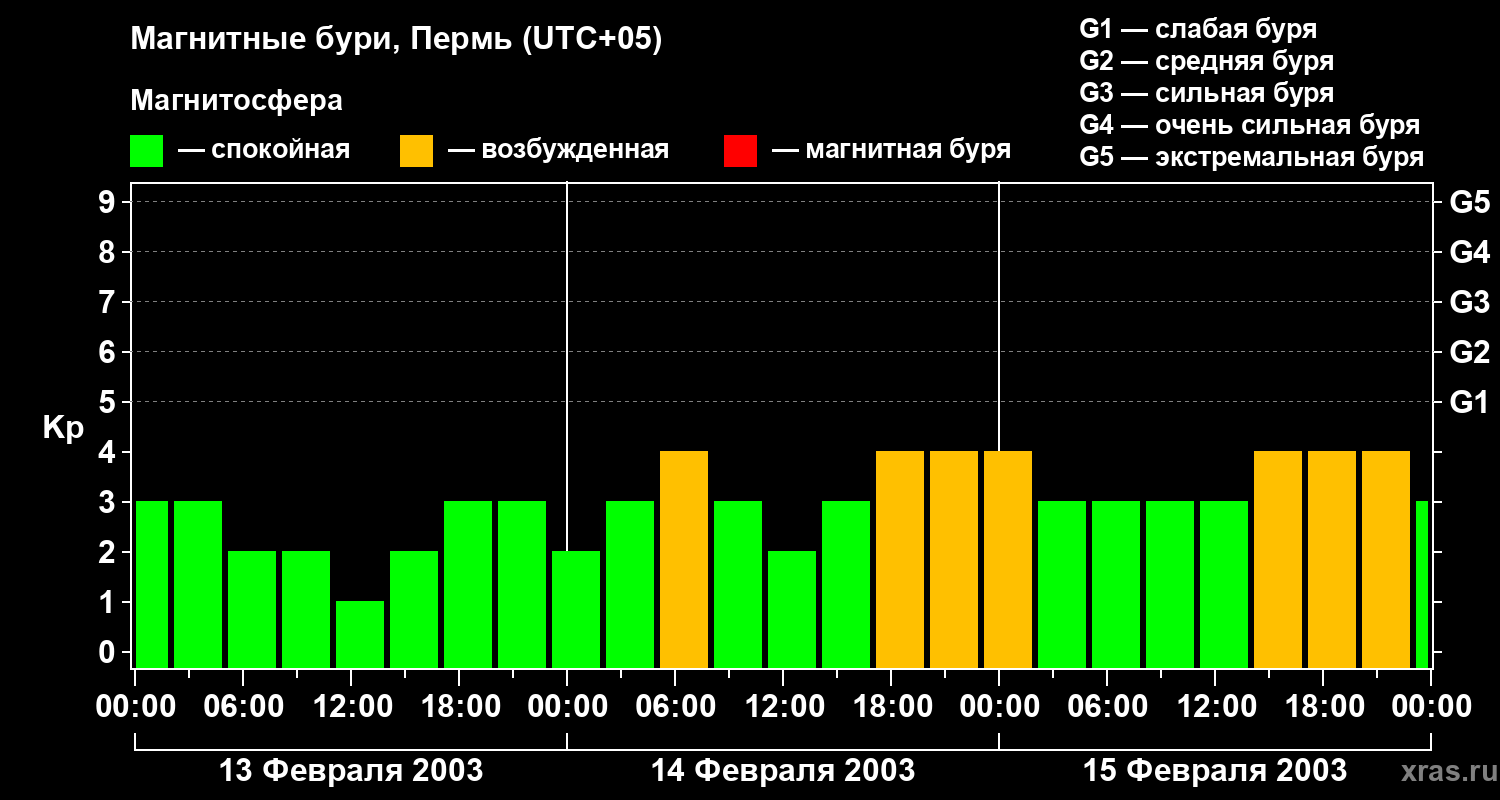 Изменения геомагнитного индекса Kp с 13 по 15 февраля 2003 года для средних широт