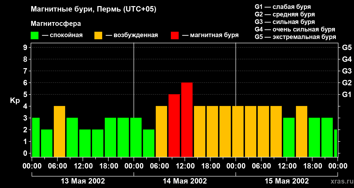 Изменения геомагнитного индекса Kp с 13 по 15 мая 2002 года для средних широт