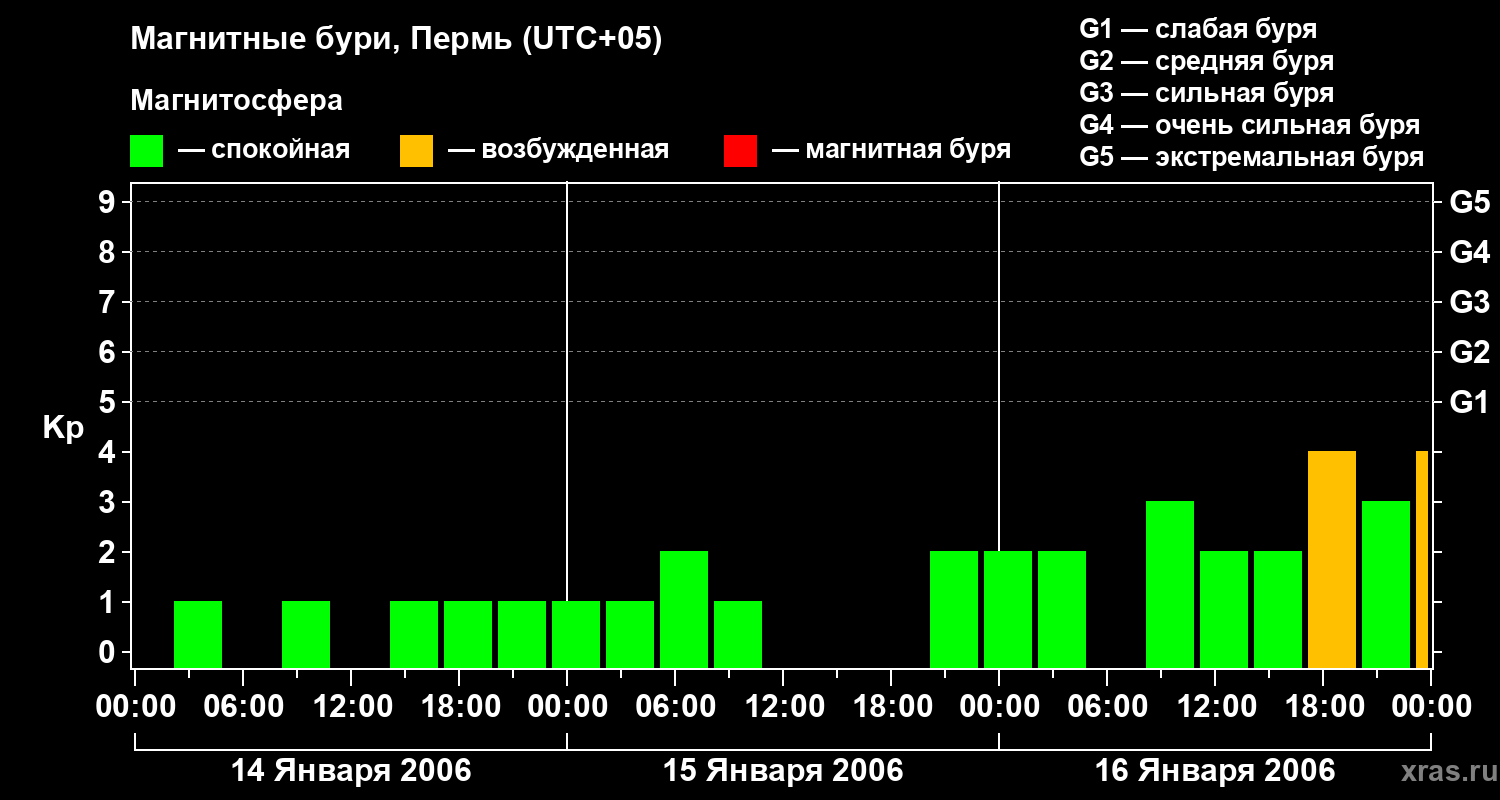 Изменения геомагнитного индекса Kp с 14 по 16 января 2006 года для средних широт