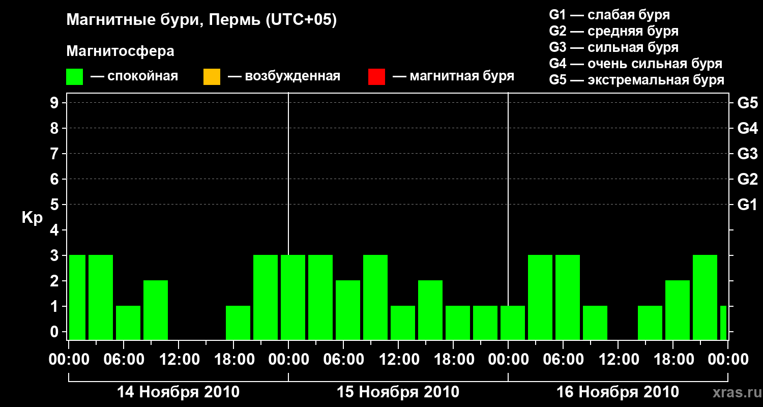 Изменения геомагнитного индекса Kp с 14 по 16 ноября 2010 года для средних широт
