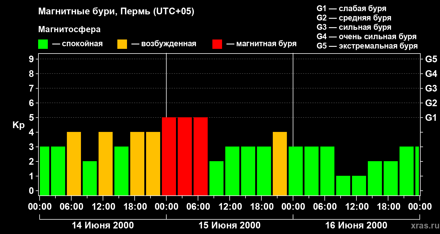 Изменения геомагнитного индекса Kp с 14 по 16 июня 2000 года для средних широт