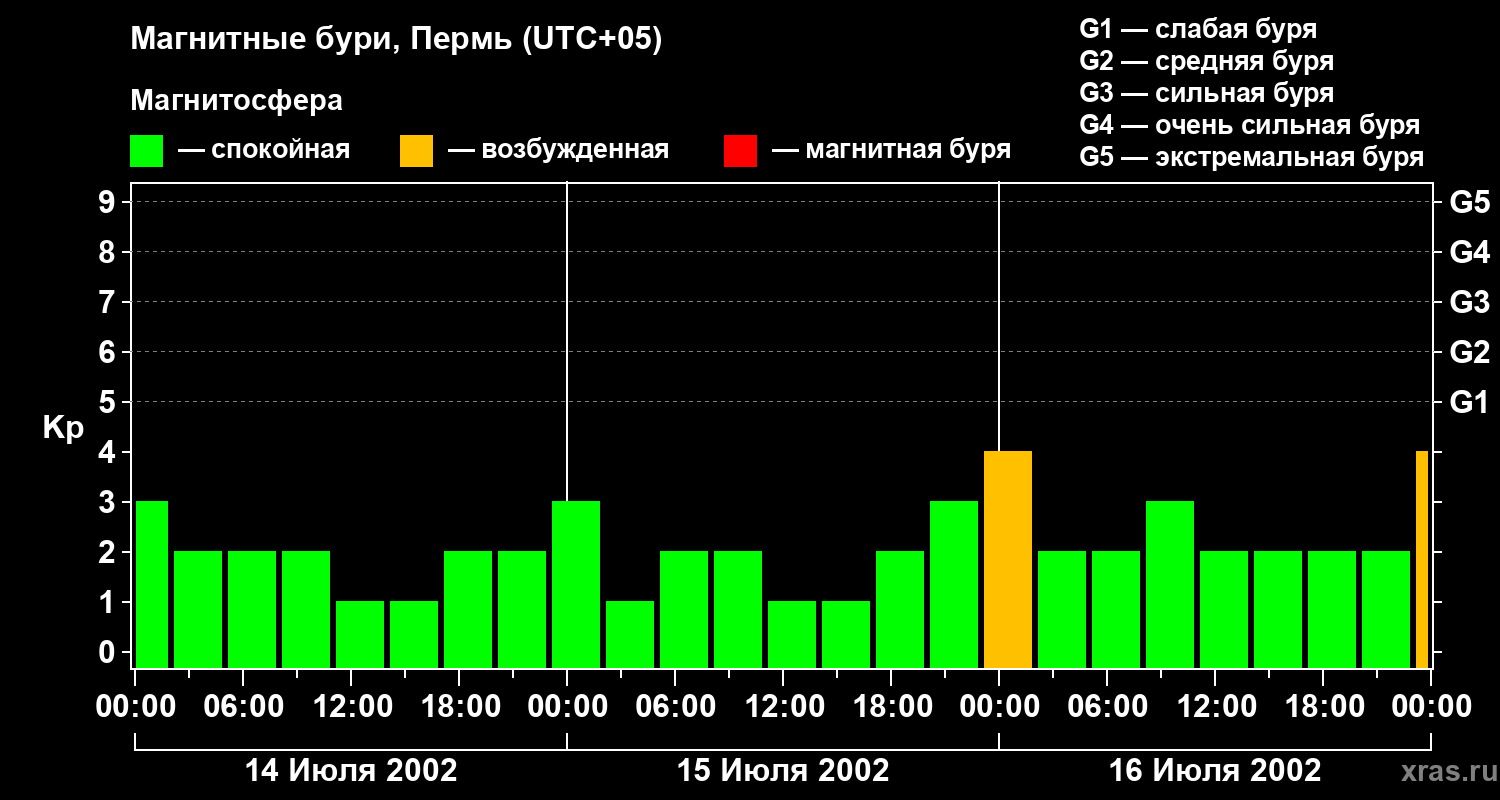 Изменения геомагнитного индекса Kp с 14 по 16 июля 2002 года для средних широт