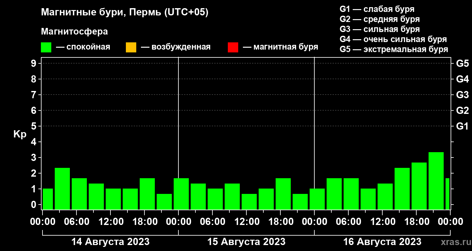 Изменения геомагнитного индекса Kp с 14 по 16 августа 2023 года для средних широт