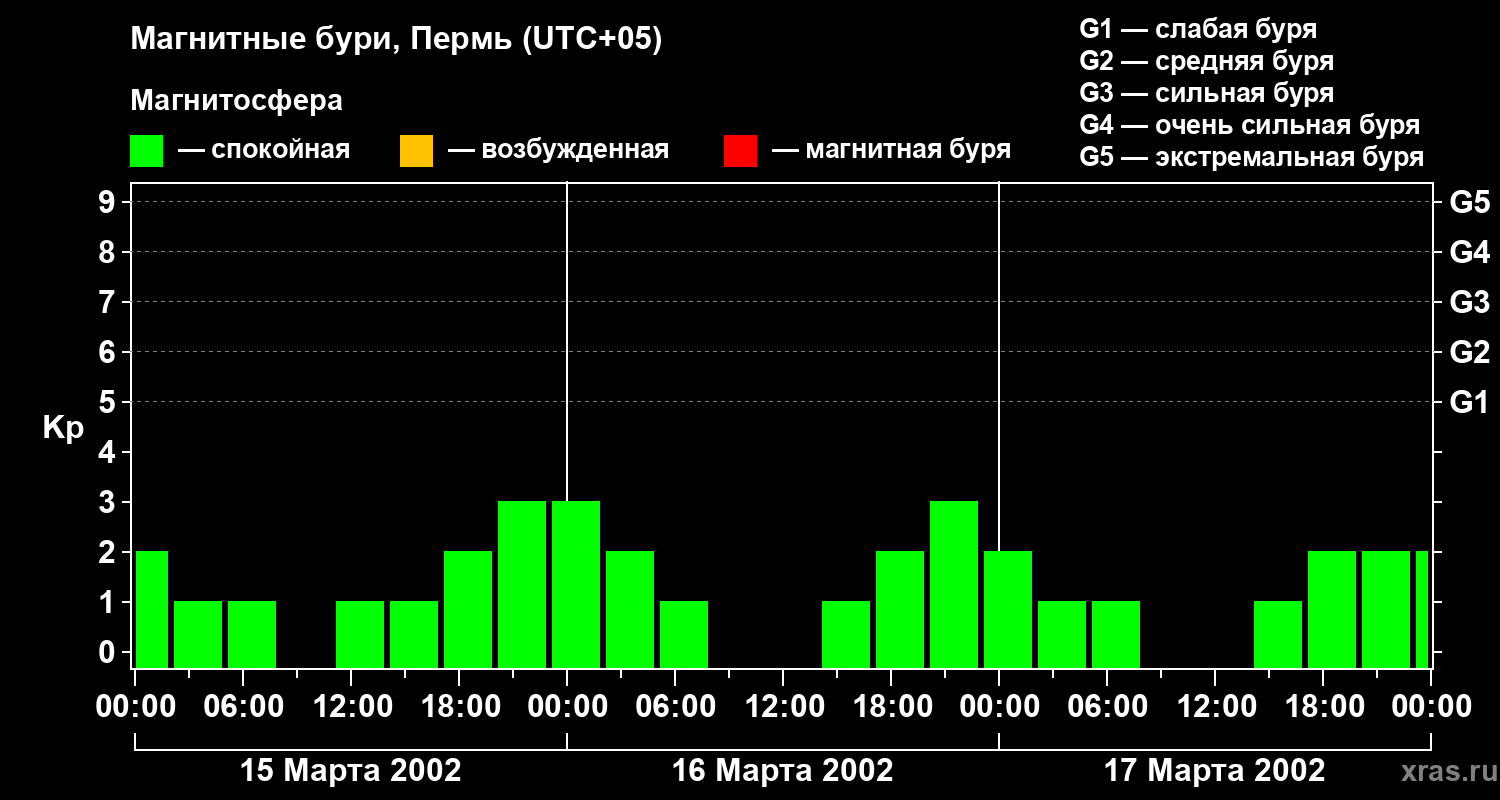 Изменения геомагнитного индекса Kp с 15 по 17 марта 2002 года для средних широт