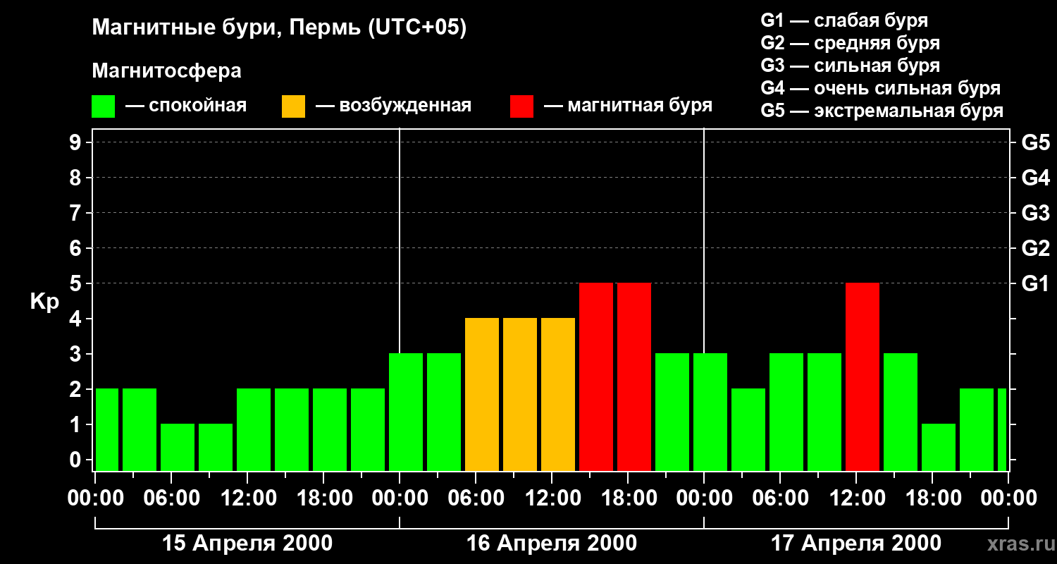 Изменения геомагнитного индекса Kp с 15 по 17 апреля 2000 года для средних широт