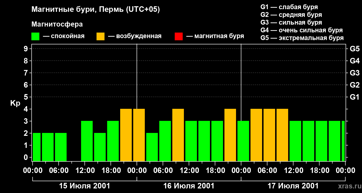 Изменения геомагнитного индекса Kp с 15 по 17 июля 2001 года для средних широт