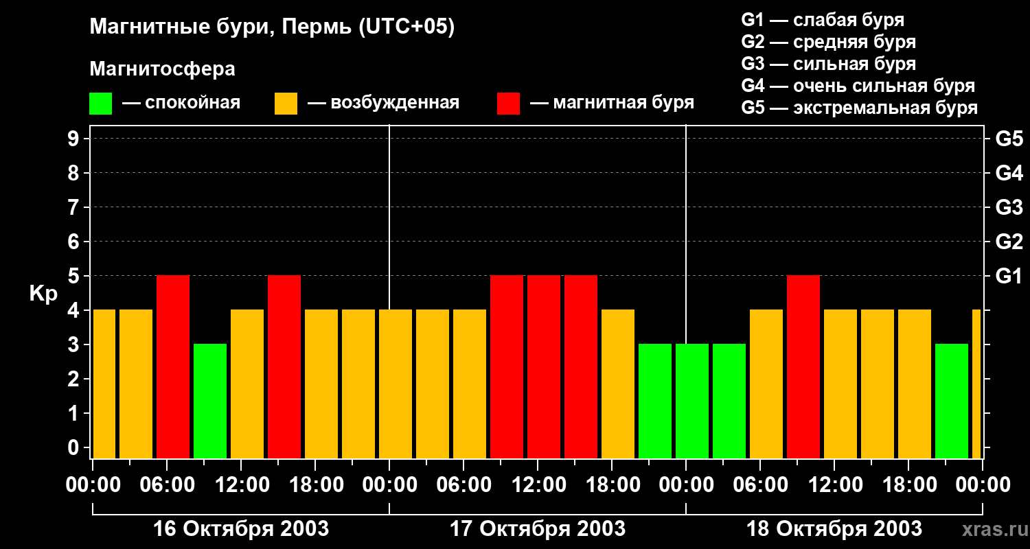 Изменения геомагнитного индекса Kp с 16 по 18 октября 2003 года для средних широт