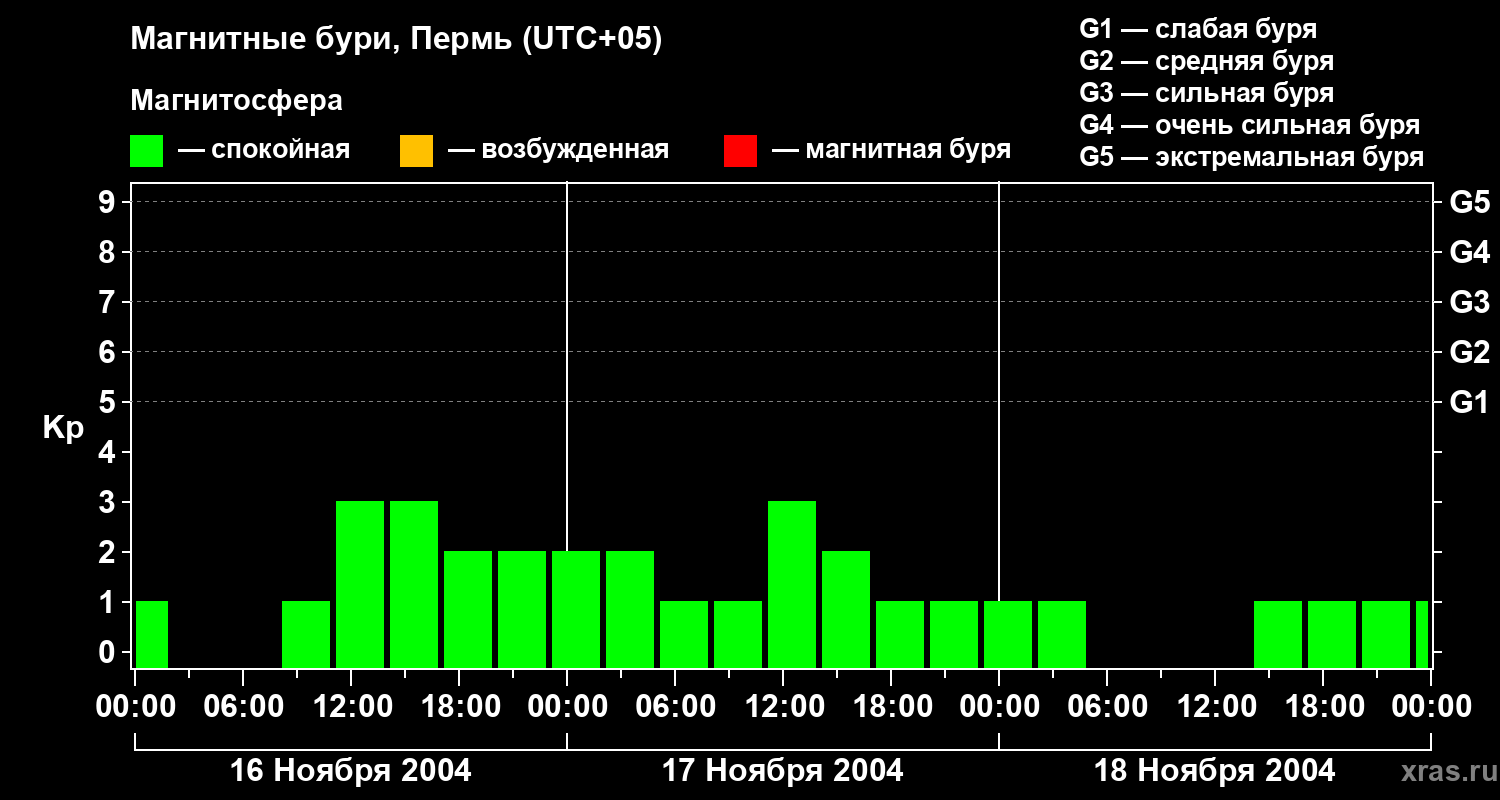 Изменения геомагнитного индекса Kp с 16 по 18 ноября 2004 года для средних широт