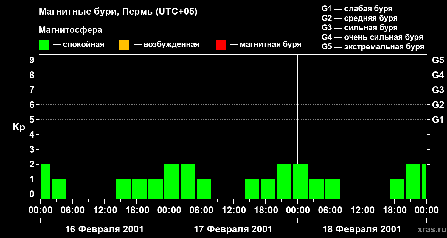 Изменения геомагнитного индекса Kp с 16 по 18 февраля 2001 года для средних широт