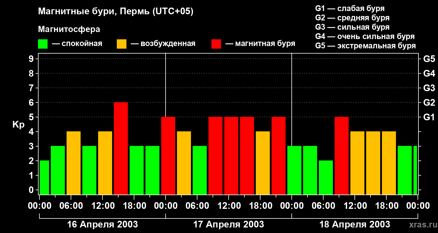 Изменения геомагнитного индекса Kp с 16 по 18 апреля 2003 года для средних широт