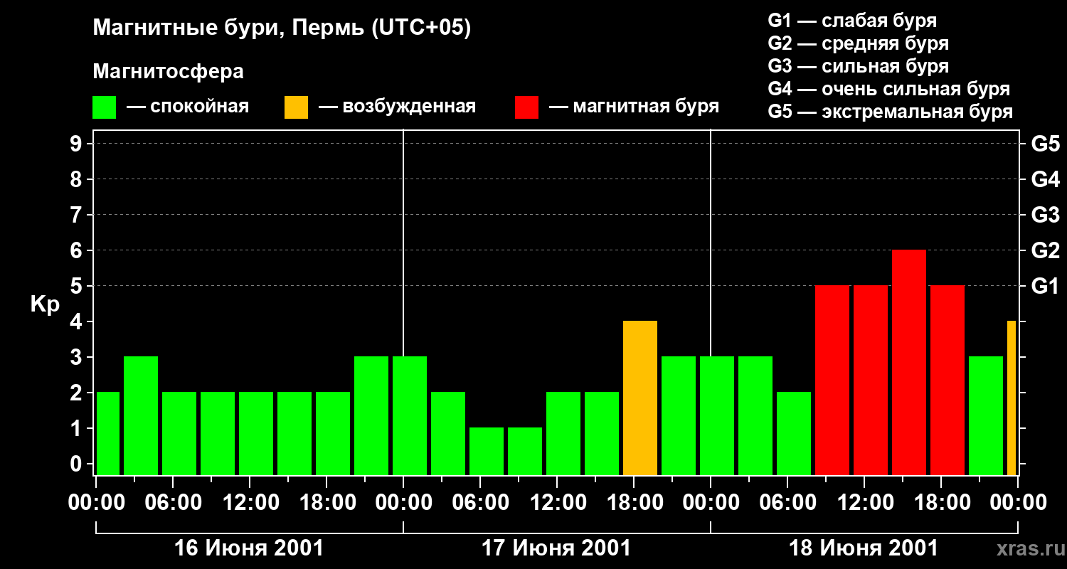 Изменения геомагнитного индекса Kp с 16 по 18 июня 2001 года для средних широт