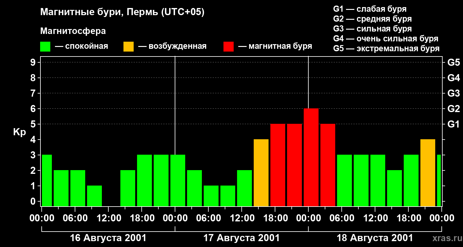 Изменения геомагнитного индекса Kp с 16 по 18 августа 2001 года для средних широт