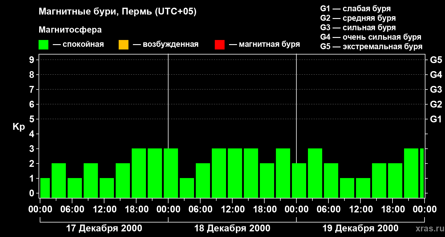Изменения геомагнитного индекса Kp с 17 по 19 декабря 2000 года для средних широт
