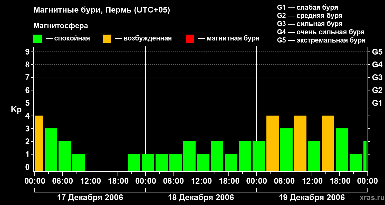 Изменения геомагнитного индекса Kp с 17 по 19 декабря 2006 года для средних широт