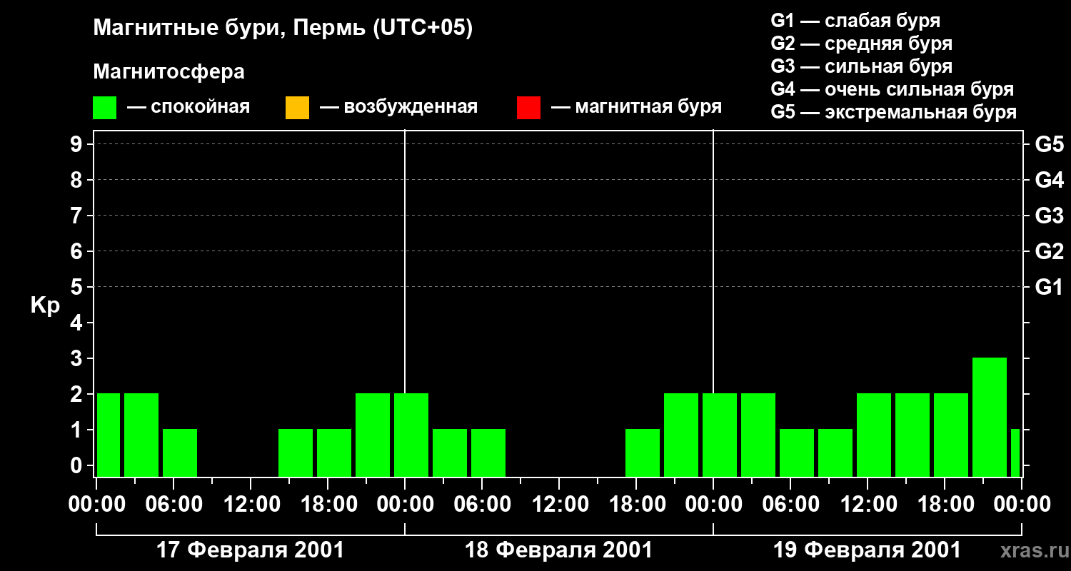 Изменения геомагнитного индекса Kp с 17 по 19 февраля 2001 года для средних широт