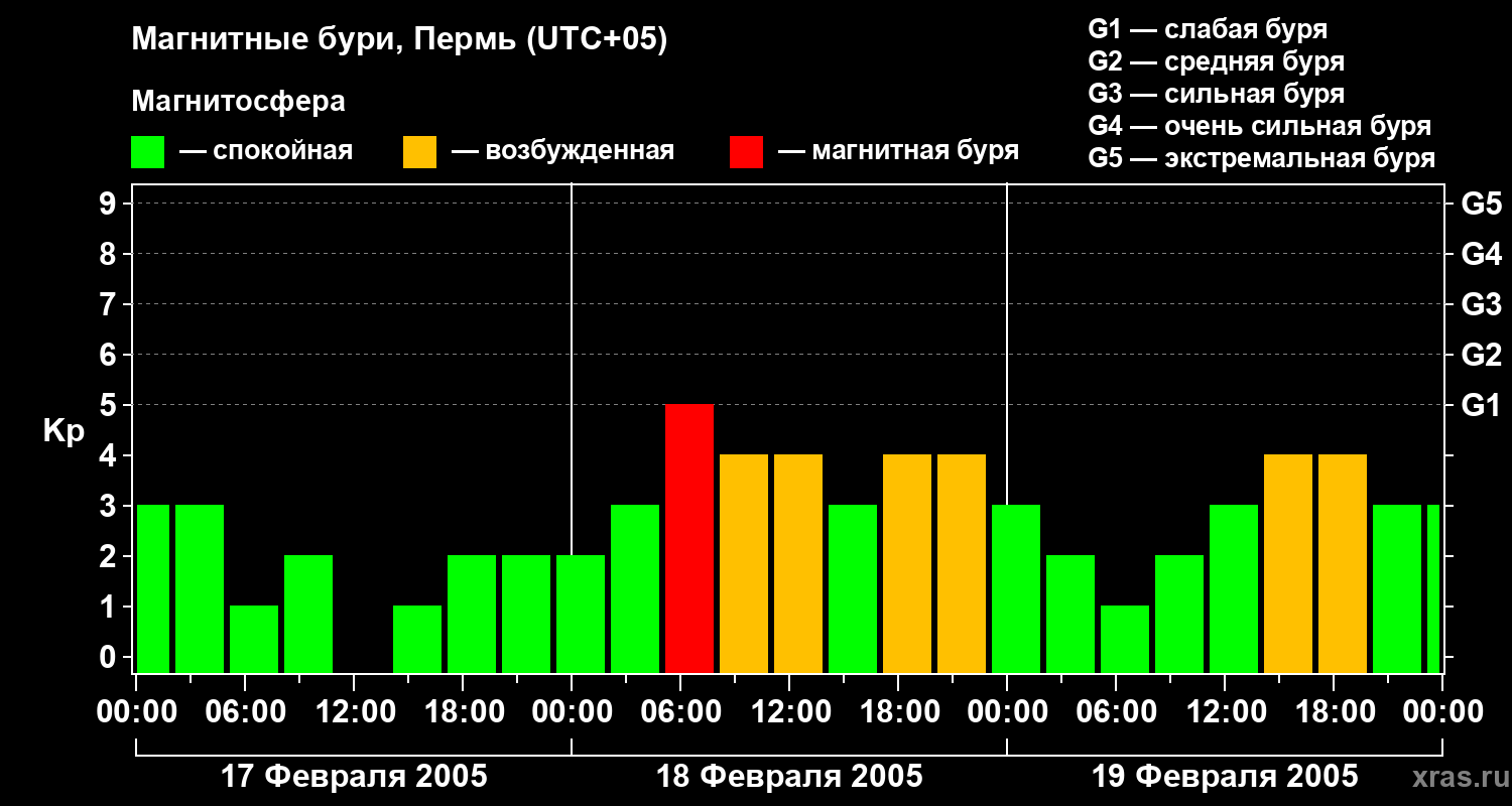 Изменения геомагнитного индекса Kp с 17 по 19 февраля 2005 года для средних широт