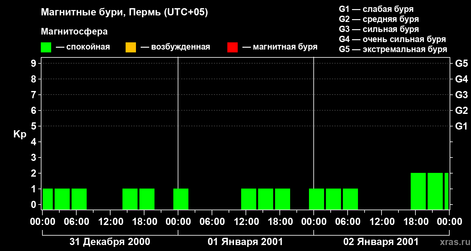 Изменения геомагнитного индекса Kp с 31 декабря 2000 года по 2 января 2001 года для средних широт