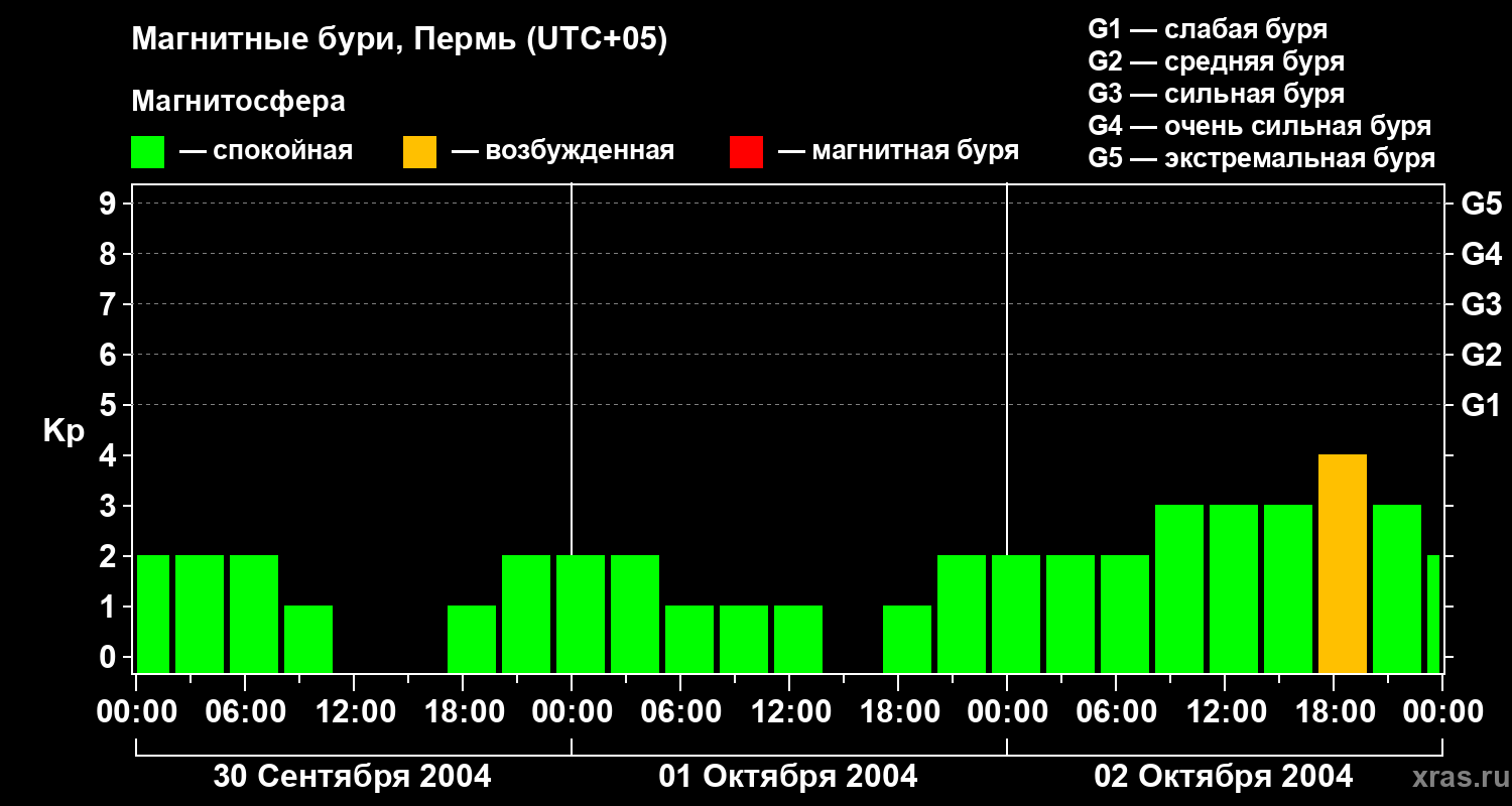 Изменения геомагнитного индекса Kp с 30 сентября по 2 октября 2004 года для средних широт