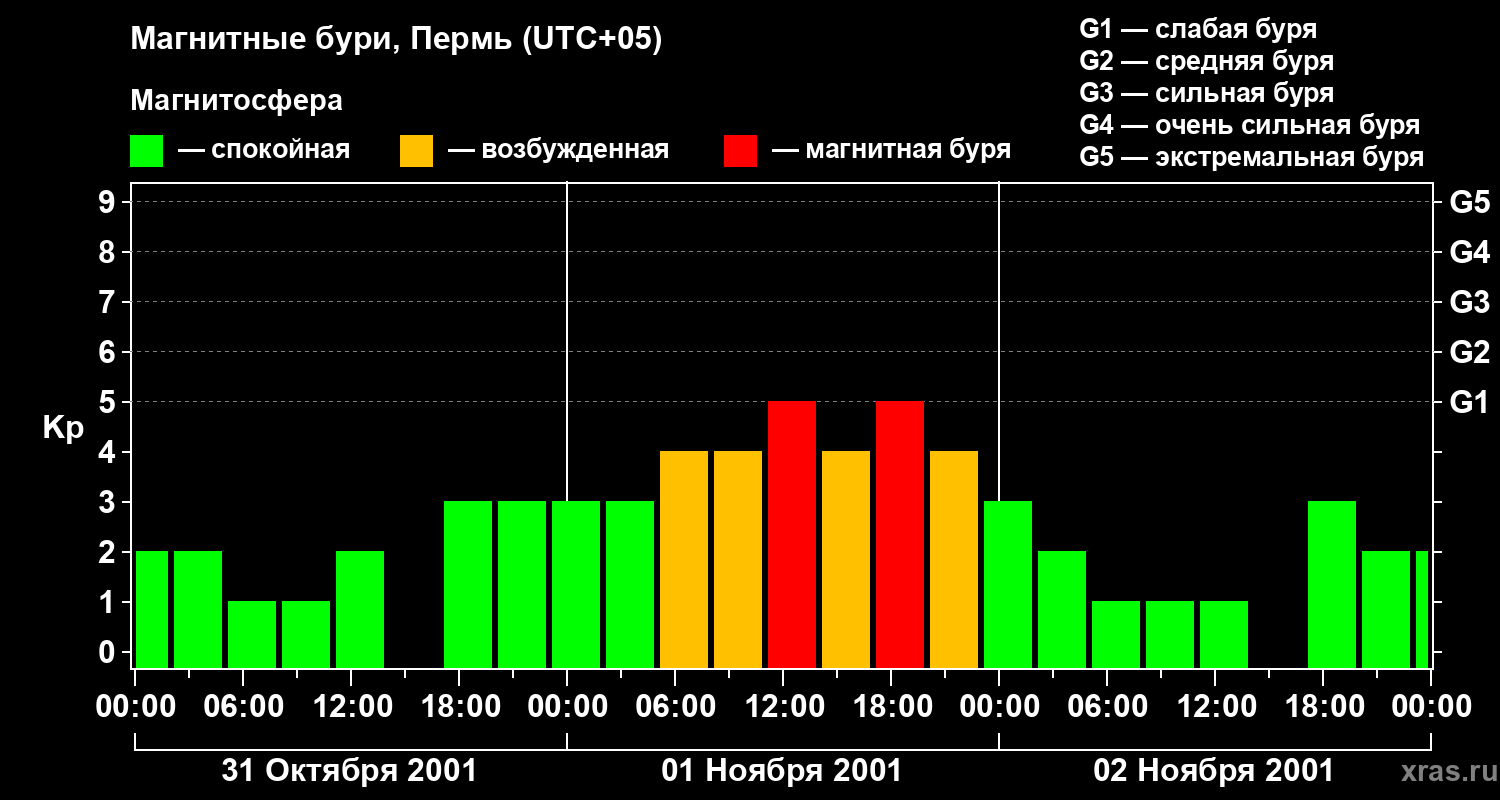 Изменения геомагнитного индекса Kp с 31 октября по 2 ноября 2001 года для средних широт