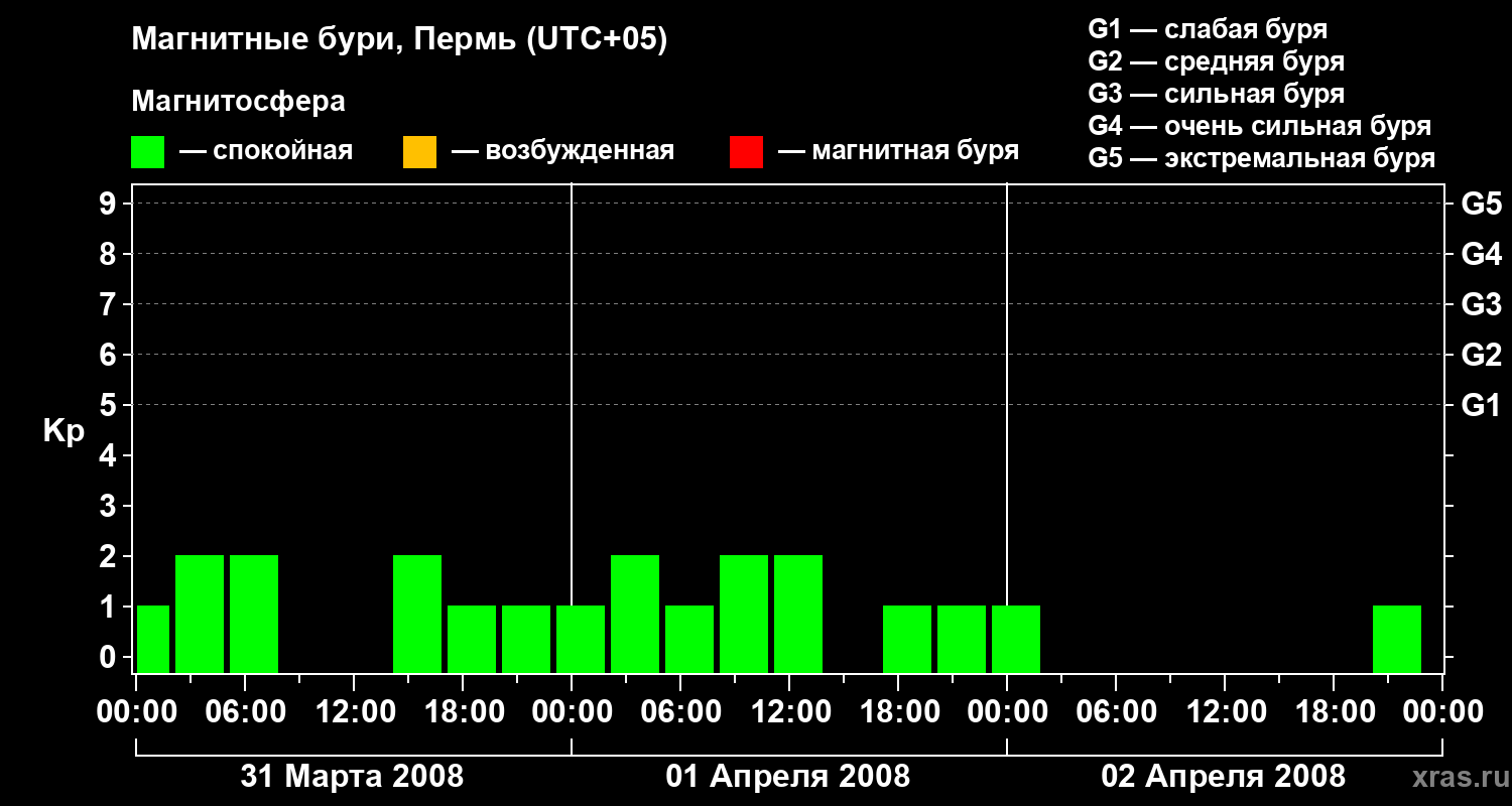 Изменения геомагнитного индекса Kp с 31 марта по 2 апреля 2008 года для средних широт