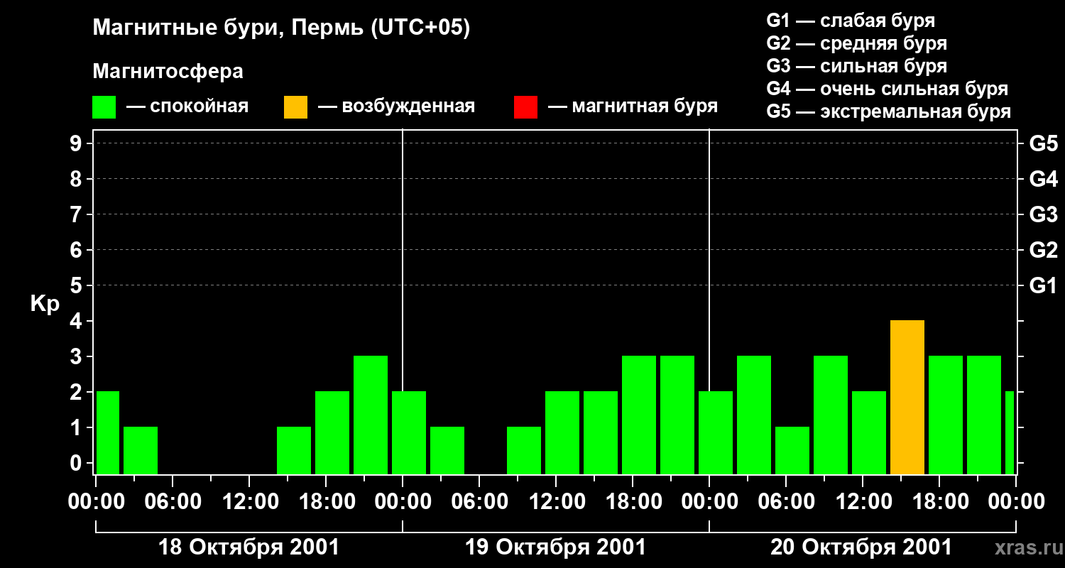 Изменения геомагнитного индекса Kp с 18 по 20 октября 2001 года для средних широт