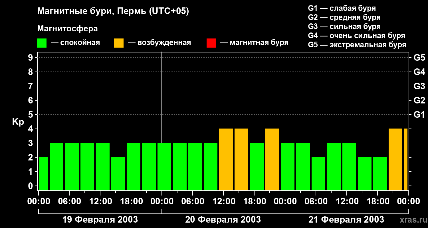 Изменения геомагнитного индекса Kp с 19 по 21 февраля 2003 года для средних широт