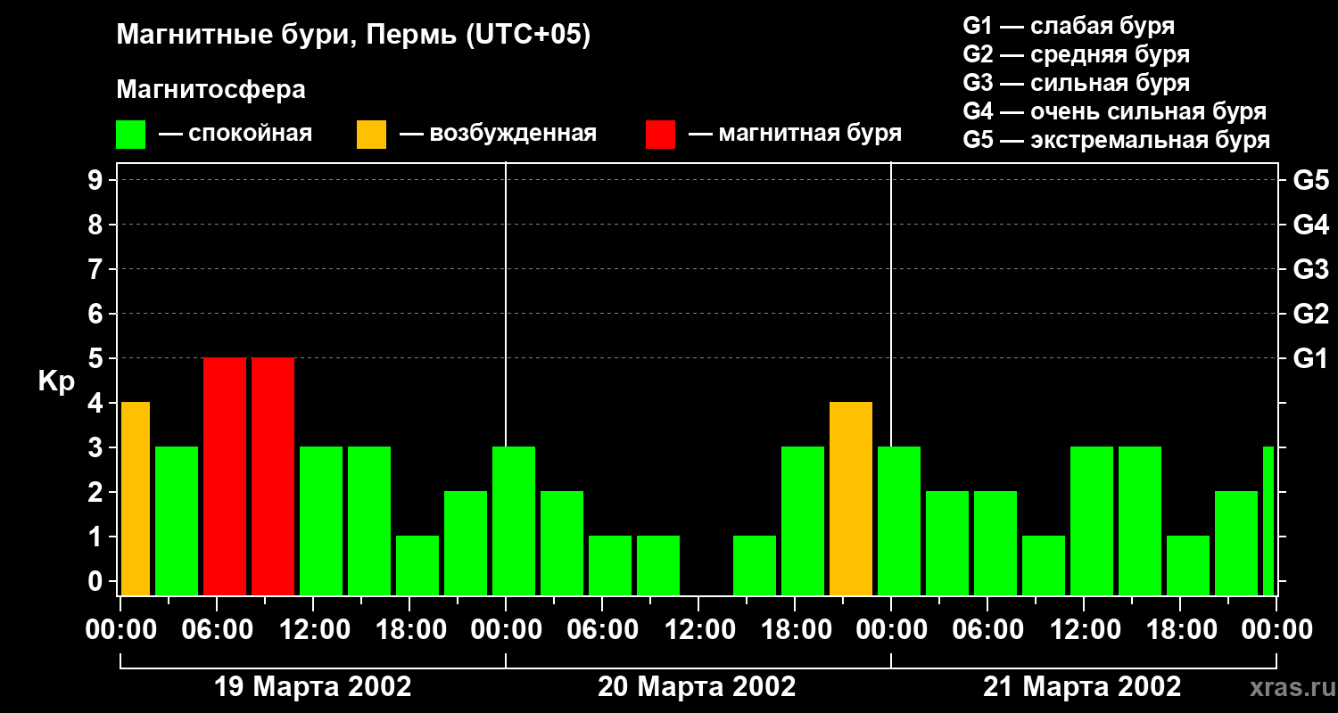 Изменения геомагнитного индекса Kp с 19 по 21 марта 2002 года для средних широт