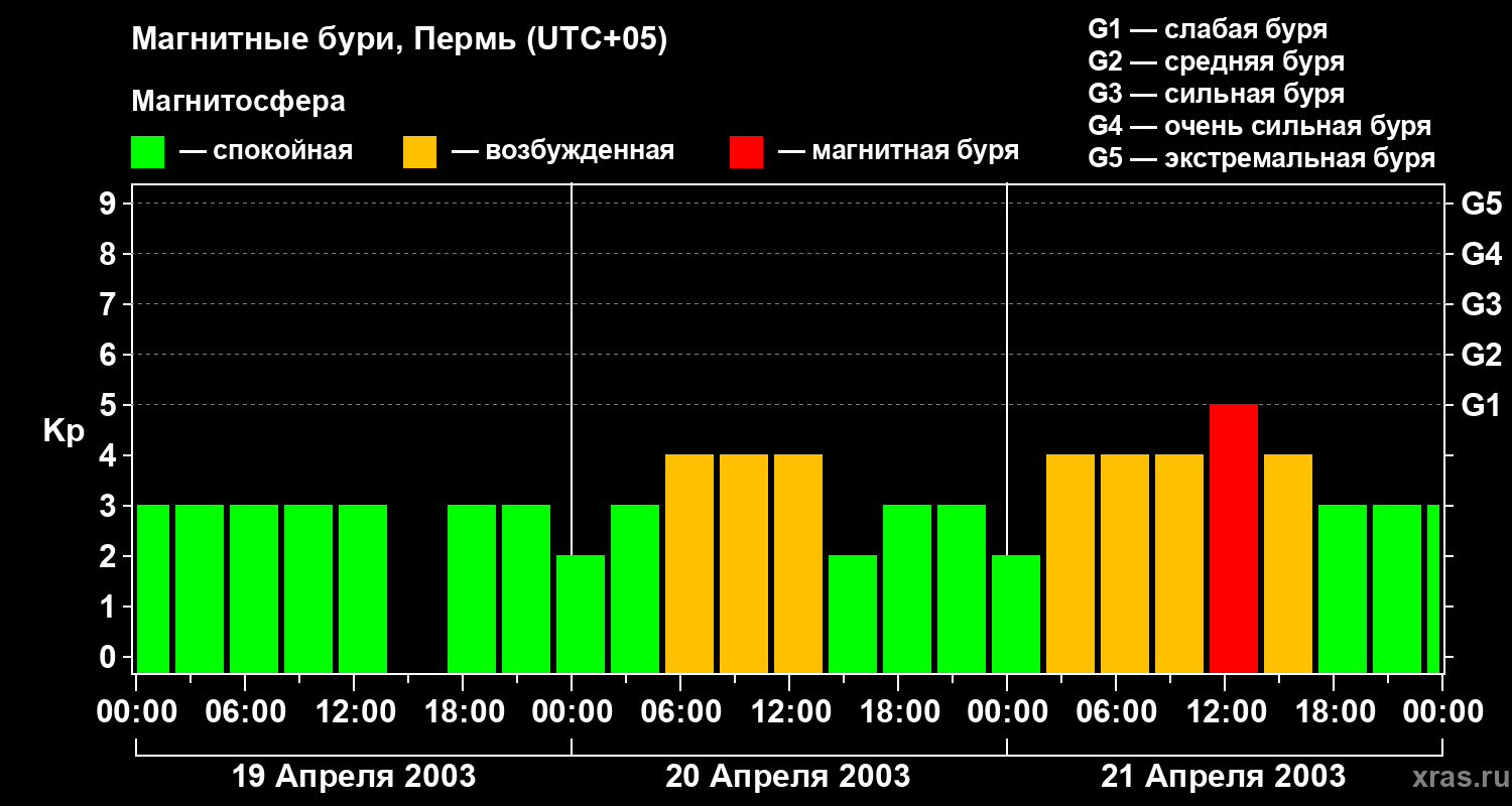 Изменения геомагнитного индекса Kp с 19 по 21 апреля 2003 года для средних широт