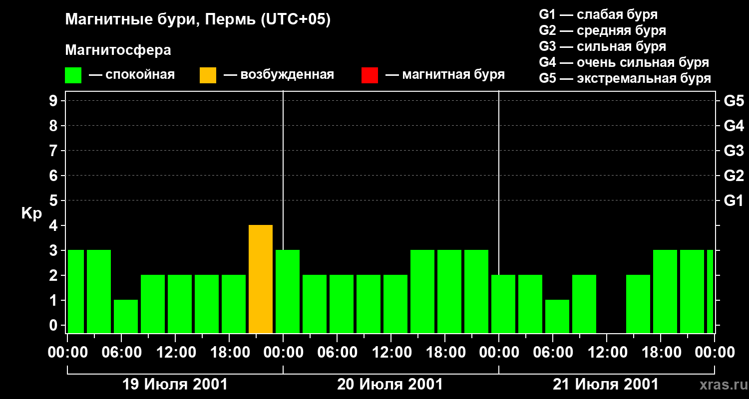 Изменения геомагнитного индекса Kp с 19 по 21 июля 2001 года для средних широт