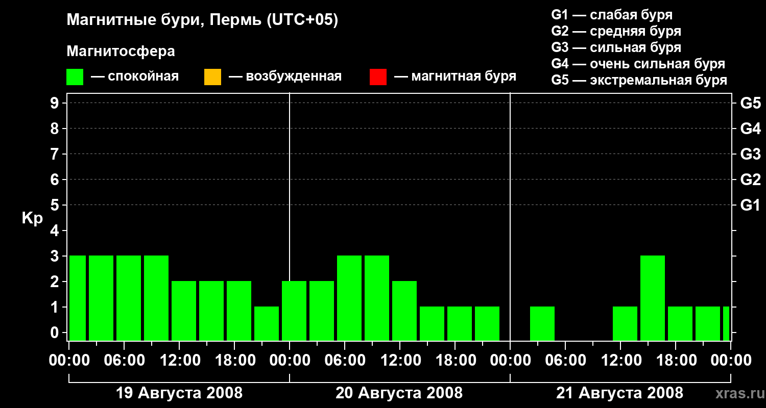 Изменения геомагнитного индекса Kp с 19 по 21 августа 2008 года для средних широт
