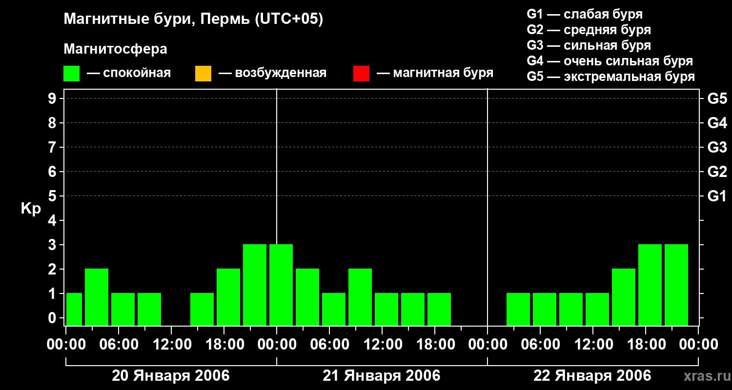 Изменения геомагнитного индекса Kp с 20 по 22 января 2006 года для средних широт