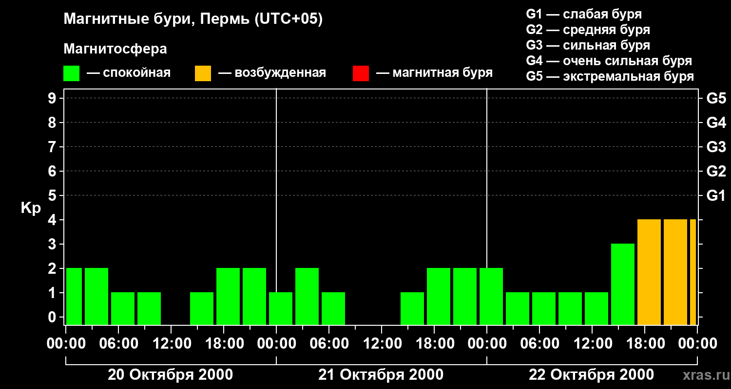 Изменения геомагнитного индекса Kp с 20 по 22 октября 2000 года для средних широт