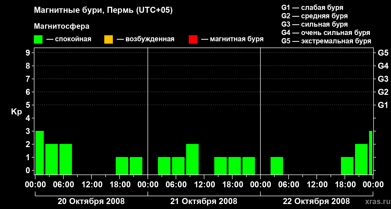 Изменения геомагнитного индекса Kp с 20 по 22 октября 2008 года для средних широт