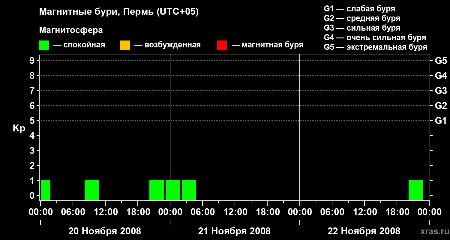 Изменения геомагнитного индекса Kp с 20 по 22 ноября 2008 года для средних широт