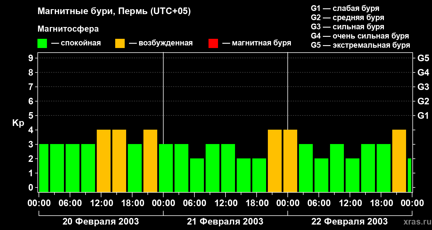 Изменения геомагнитного индекса Kp с 20 по 22 февраля 2003 года для средних широт