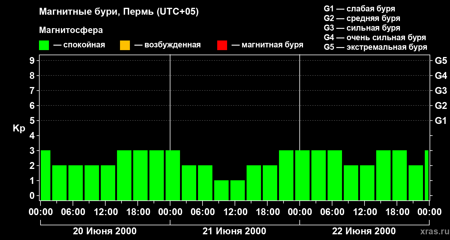 Изменения геомагнитного индекса Kp с 20 по 22 июня 2000 года для средних широт