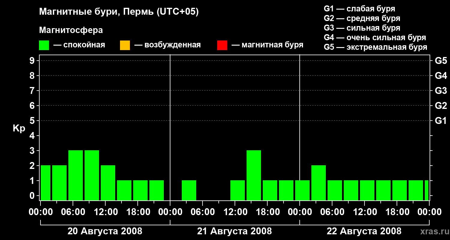 Изменения геомагнитного индекса Kp с 20 по 22 августа 2008 года для средних широт