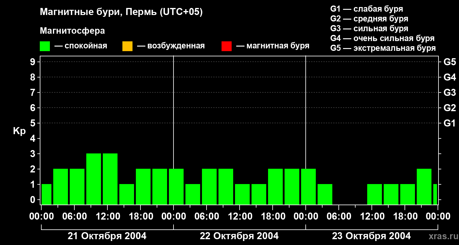Изменения геомагнитного индекса Kp с 21 по 23 октября 2004 года для средних широт