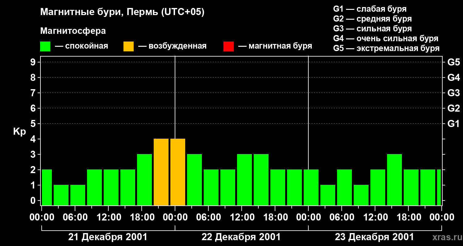Изменения геомагнитного индекса Kp с 21 по 23 декабря 2001 года для средних широт