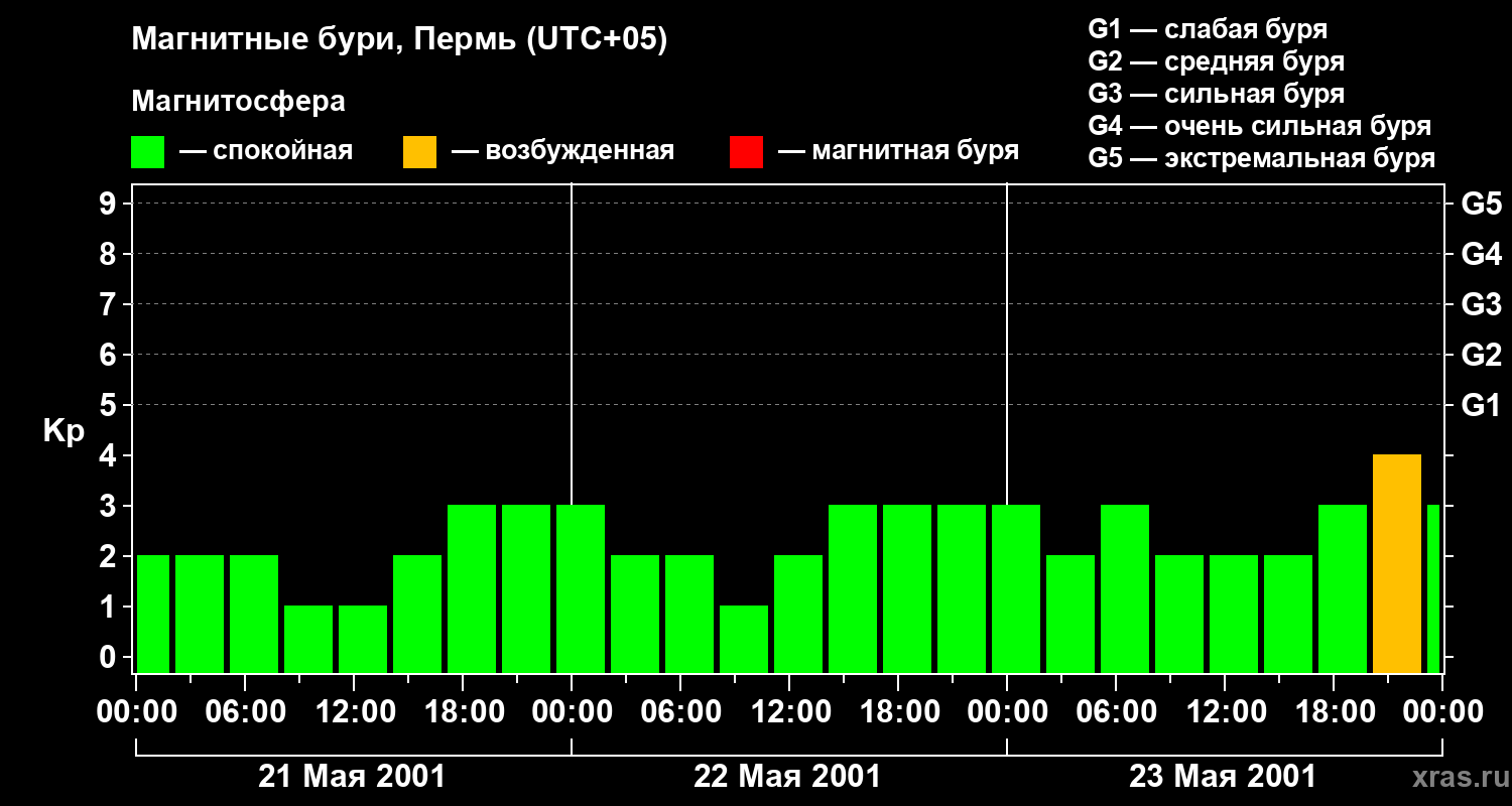 Изменения геомагнитного индекса Kp с 21 по 23 мая 2001 года для средних широт