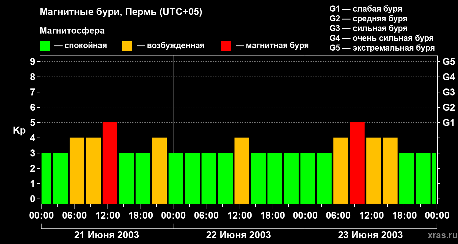 Изменения геомагнитного индекса Kp с 21 по 23 июня 2003 года для средних широт