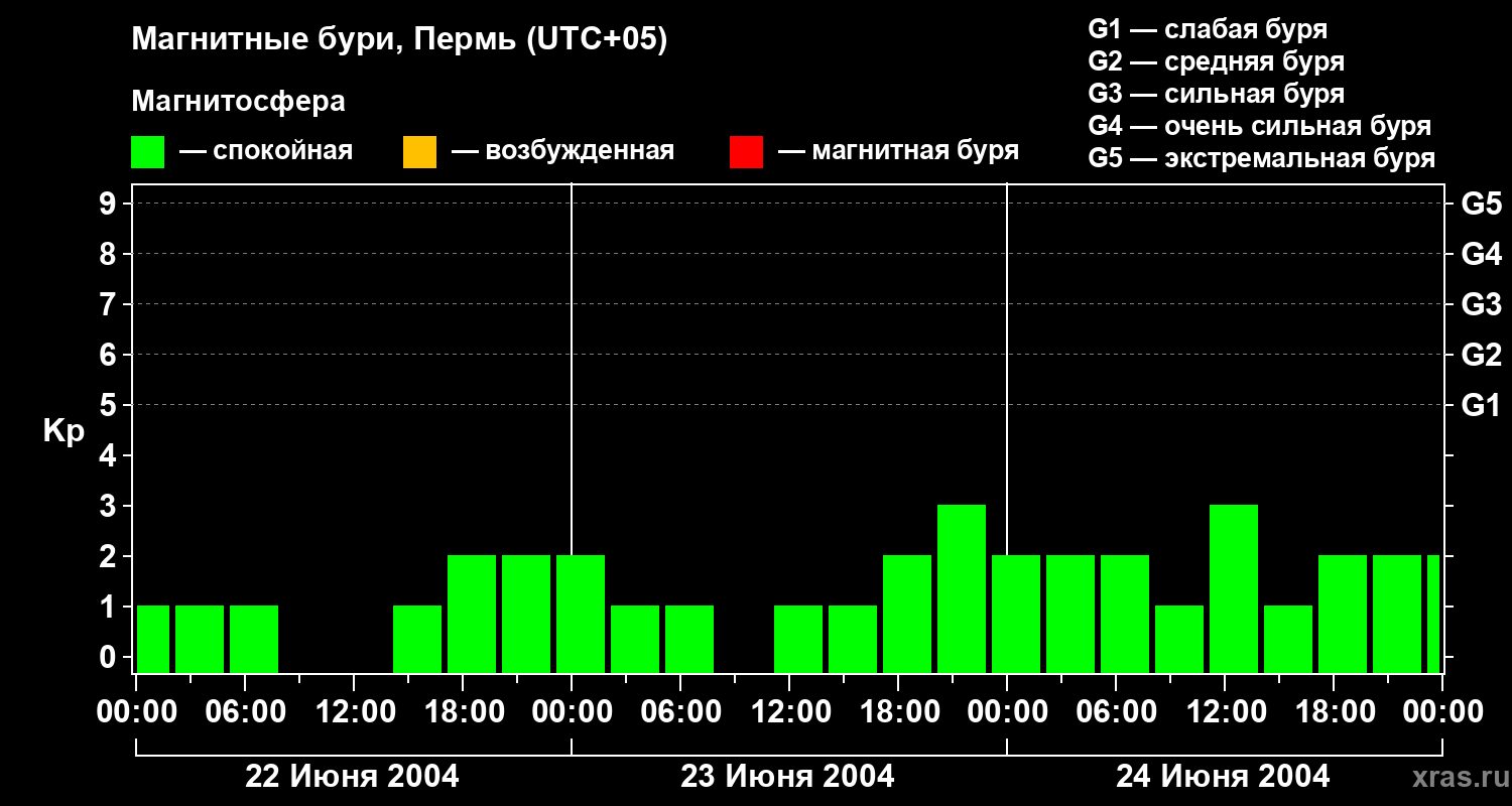 Изменения геомагнитного индекса Kp с 22 по 24 июня 2004 года для средних широт