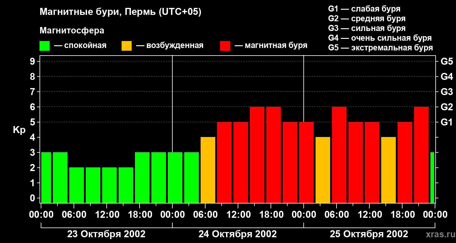 Изменения геомагнитного индекса Kp с 23 по 25 октября 2002 года для средних широт