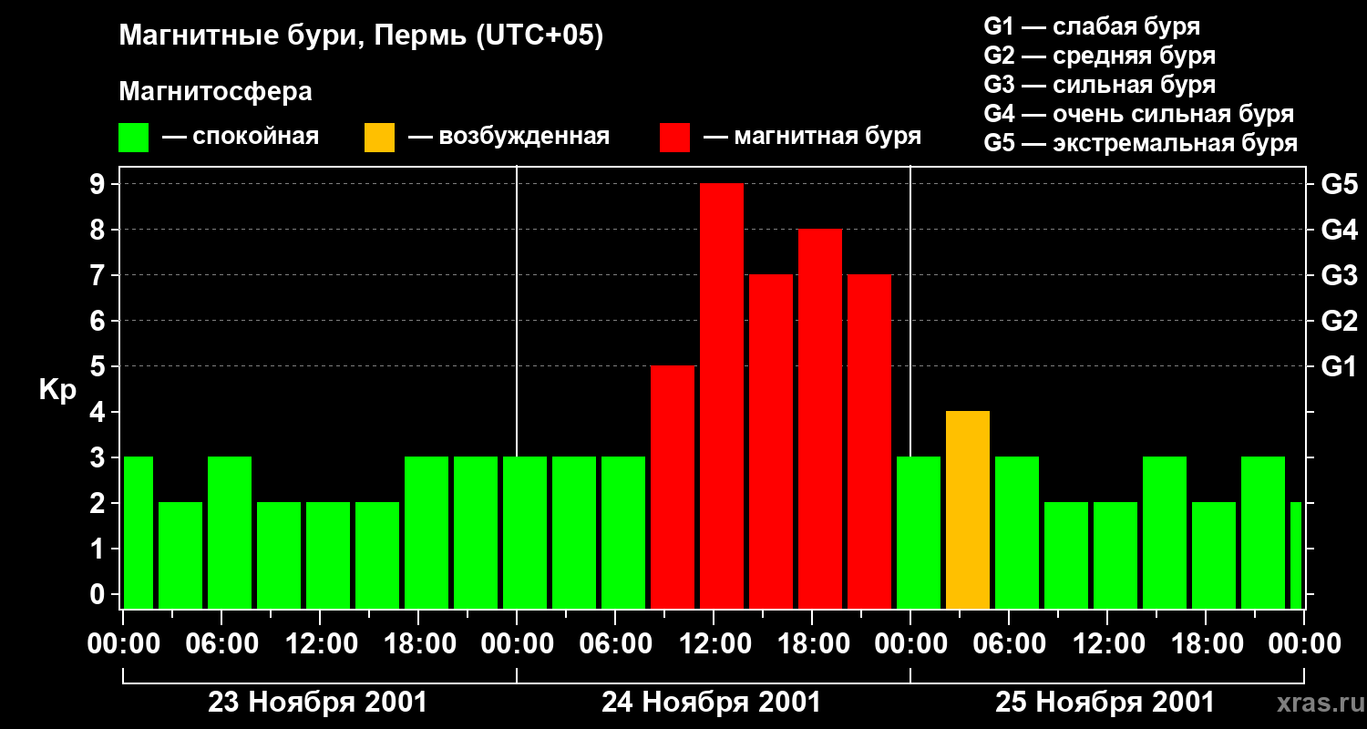 Изменения геомагнитного индекса Kp с 23 по 25 ноября 2001 года для средних широт