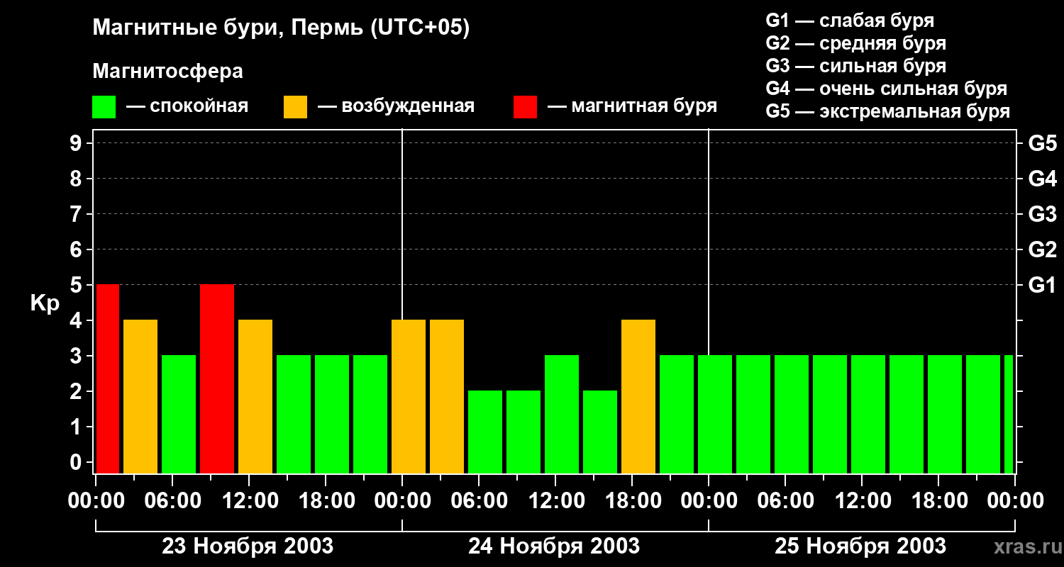 Изменения геомагнитного индекса Kp с 23 по 25 ноября 2003 года для средних широт
